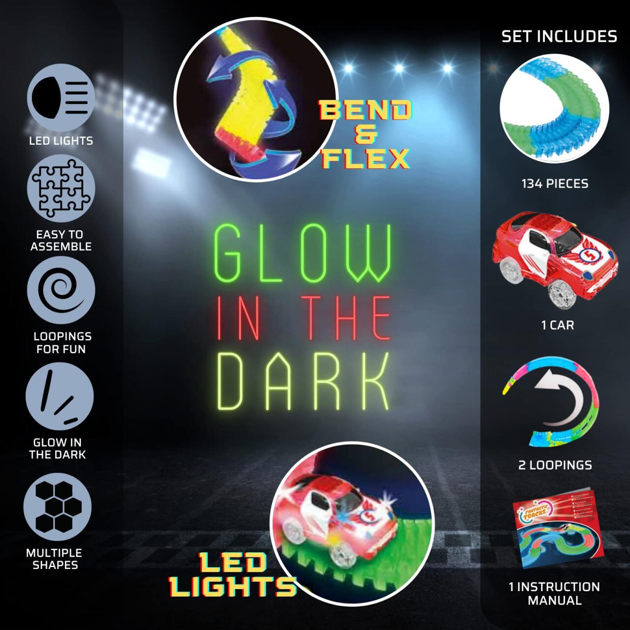 Las pistas son flexibles, coloridas y brillan en la oscuridad, haciendo que el juego sea aún más emocionante, especialmente por la noche.
